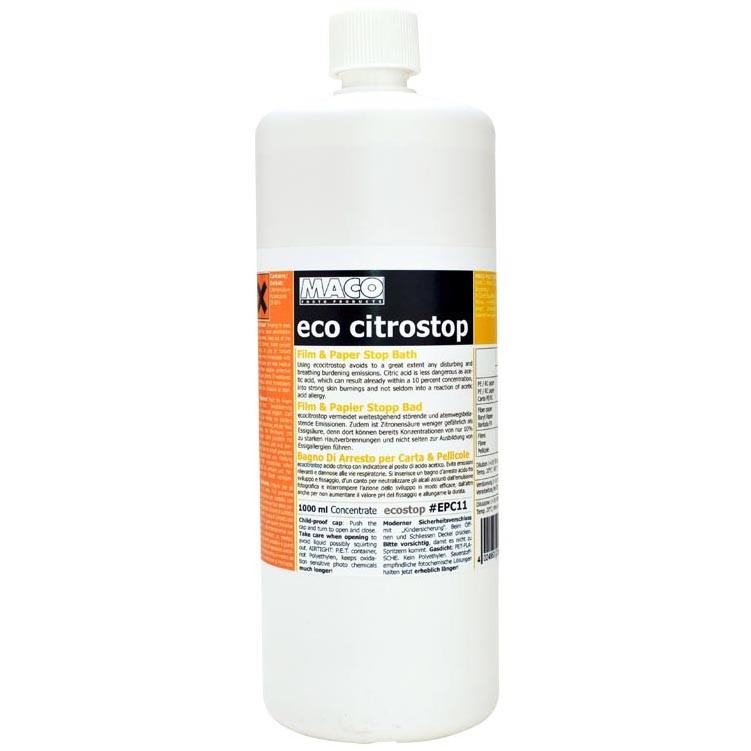 MACO ecocitrostop è un bagno di arresto universale con indicatore di colore per pellicole in bianco e nero e carta.