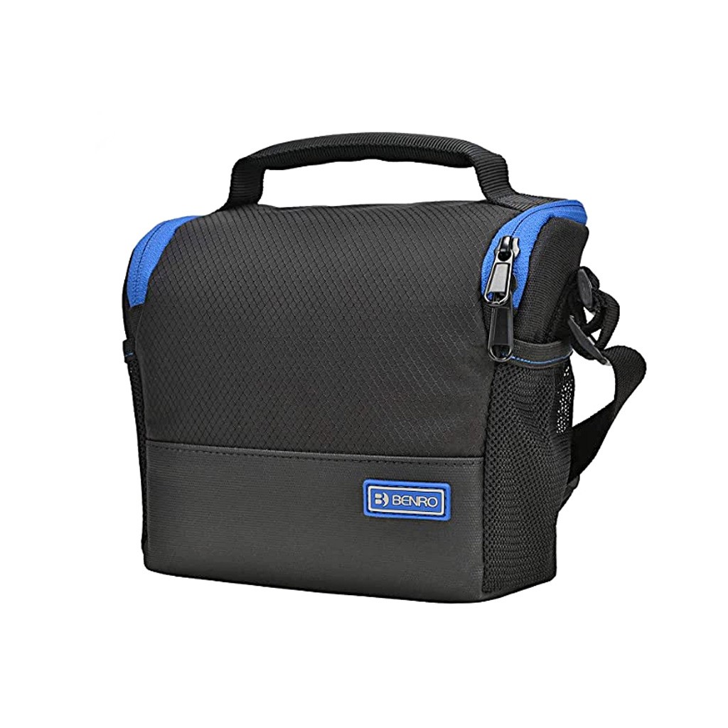 Due tasche interne per memory card, due tasche esterne laterali per piccoli accessori.Tracolla regolabile e maniglia superiore per il trasporto.
