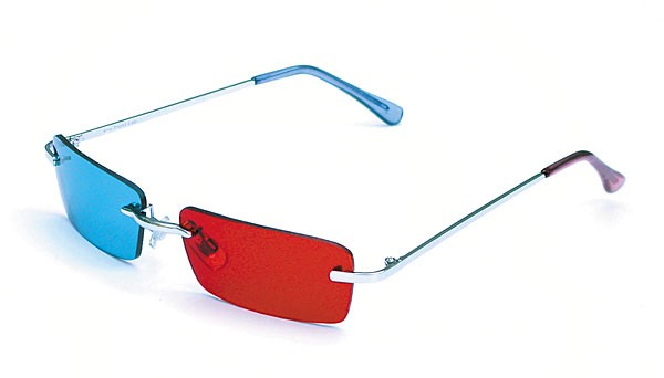 Occhiali anaglifi con lenti a vista e stanghette in metallo argentato.