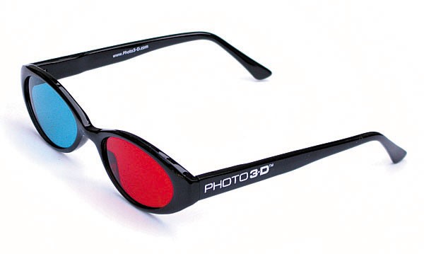 Occhiali anaglifi con montatura in plastica opaca nera, forma "occhi di gatto".